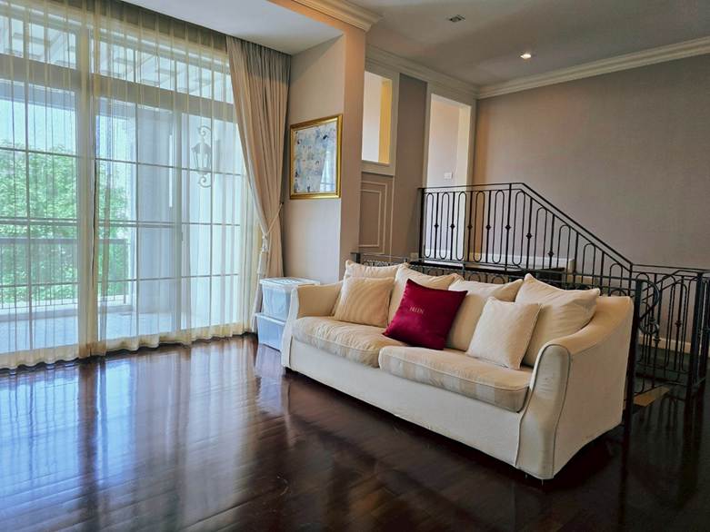 ทางขึ้นบันไดชั้น 2 มีขนาดกำลังดี ไม่แคบจนเกินไป ใช้วัสดุเป็นไม้สักแท้ ตกแต่งด้วยราวจับเหล็กที่มีลวดลายสวยงาม ไฟทางเดินมีความสว่าง มีชานพักขนาดใหญ่ ทำให้ผู้อยู่อาศัยมีความปลอดภัย พื้นไม้ที่ใช้บนชั้น 2 คือไม้สักแท้ที่ปูต่อกันได้อย่างเป็นระเบียบ ให้ผิวสัมผัสที่นุ่มลื่นสบายเท้า โทนสีของไม้จะออกเข้มแสดงถึงความมั่นคงและอบอุ่นให้แก่ผู้อยู่อาศัยภายในบ้าน เมื่อขึ้นมาชั้น 2 จะเจอกับโถงกลางที่ถูกออกแบบเป็น ห้องนั่งเล่นส่วนตัว อีกหนึ่งจุดไฮไลท์ ตรงนี้มีระเบียงกว้าง สามารถเปิดประตูออกไปรับลมธรรมชาติได้ เหมาะสำหรับการนั่งอ่านหนังสือหรือใช้เวลาร่วมกันในครอบครัว