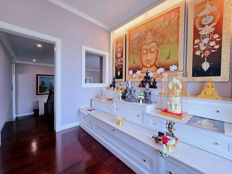 สิ่งที่หลายบ้านไม่มีแต่บ้านนี้มีคือ ห้องพระ ที่ถูกจัดไว้แยกเป็นสัดส่วนบริเวณจุดเชื่อมต่อกับโถงกลางเล่นระดับบันไดขึ้นไปที่ห้องพระ เพิ่มบรรยากาศสงบและศักดิ์สิทธิ์ให้กับบ้าน