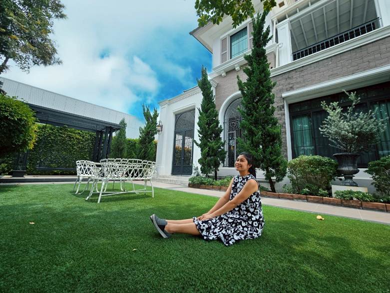 เจ้าของบ้านมีการออกแบบสวนอย่างลงตัวและใช้งานได้จริง ในสไตล์อังกฤษ ด้านหน้าเป็นสนามหญ้าเทียมขนาดใหญ่ การดูแลรักษาจึงง่ายและประหยัดค่าใช้จ่าย มีชิงช้าใหญ่ตั้งอยู่ใต้ร่มไม้ เหมาะสำหรับการนั่งเล่นหรือใช้เวลาอ่านหนังสือในวันที่อากาศดีๆ พร้อมทั้งดูเด็กๆ วิ่งเล่นอยู่ในสวน บรรยากาศภายนอกเหมือนอยู่บ้านพักตากอากาศส่วนตัว