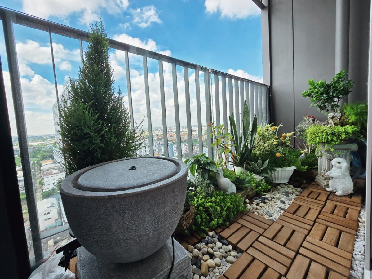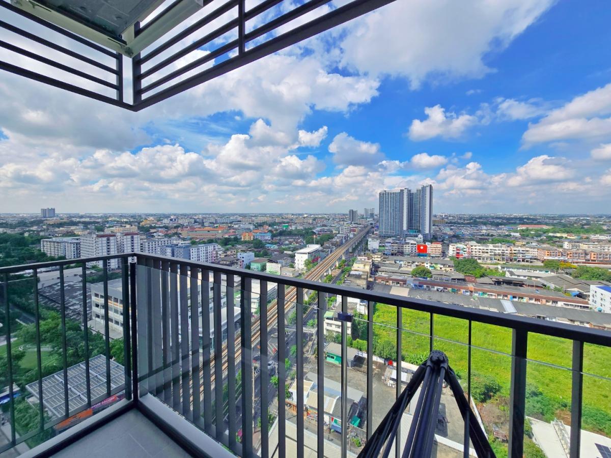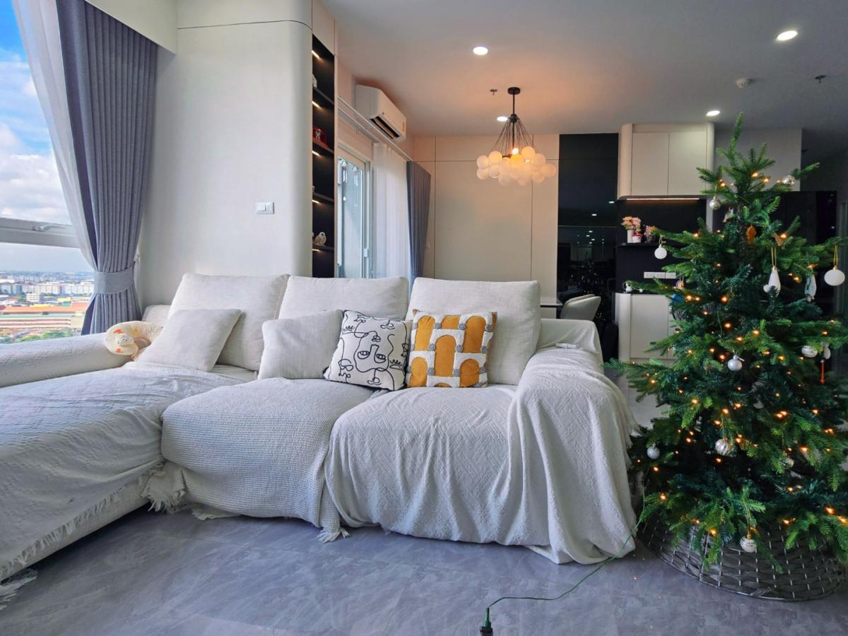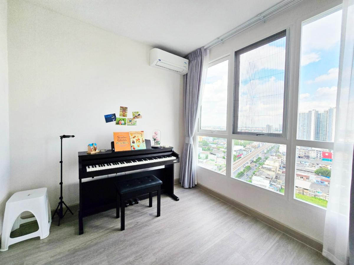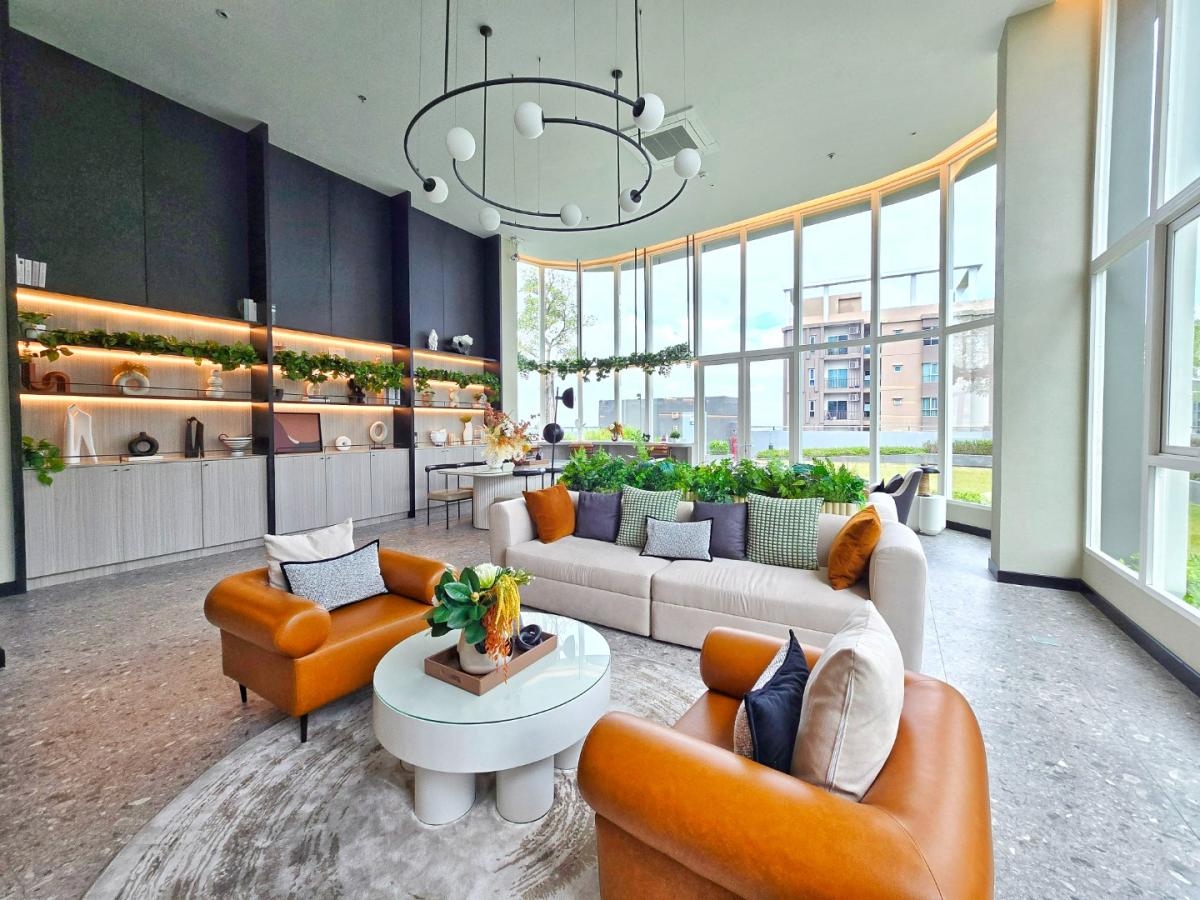 - ฝ้าโปร่งสูง 2.7 เมตร ตกแต่งเพิ่มแสงสว่างด้วยโคมไฟสไตล์โมเดิร์น พร้อมม่านซ่อนราง ติดมุ้งรับลม และเพิ่มความปลอดภัยด้วยกระจกติดราวระเบียง