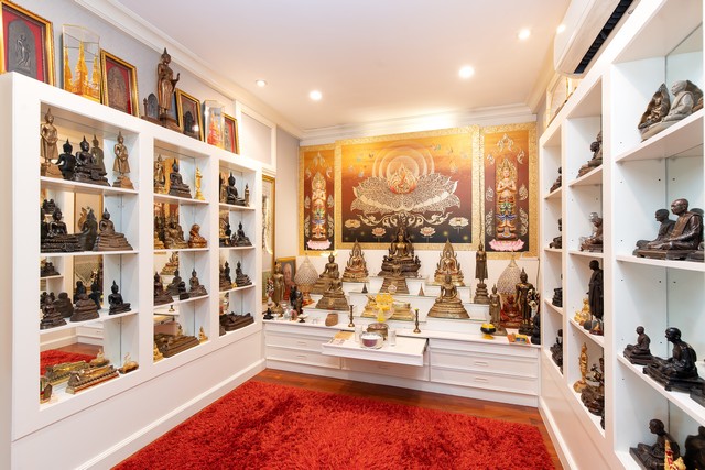 - ชั้นบนตรงโถงกลางจัดเป็นห้องพระ ตกแต่งแล้ว