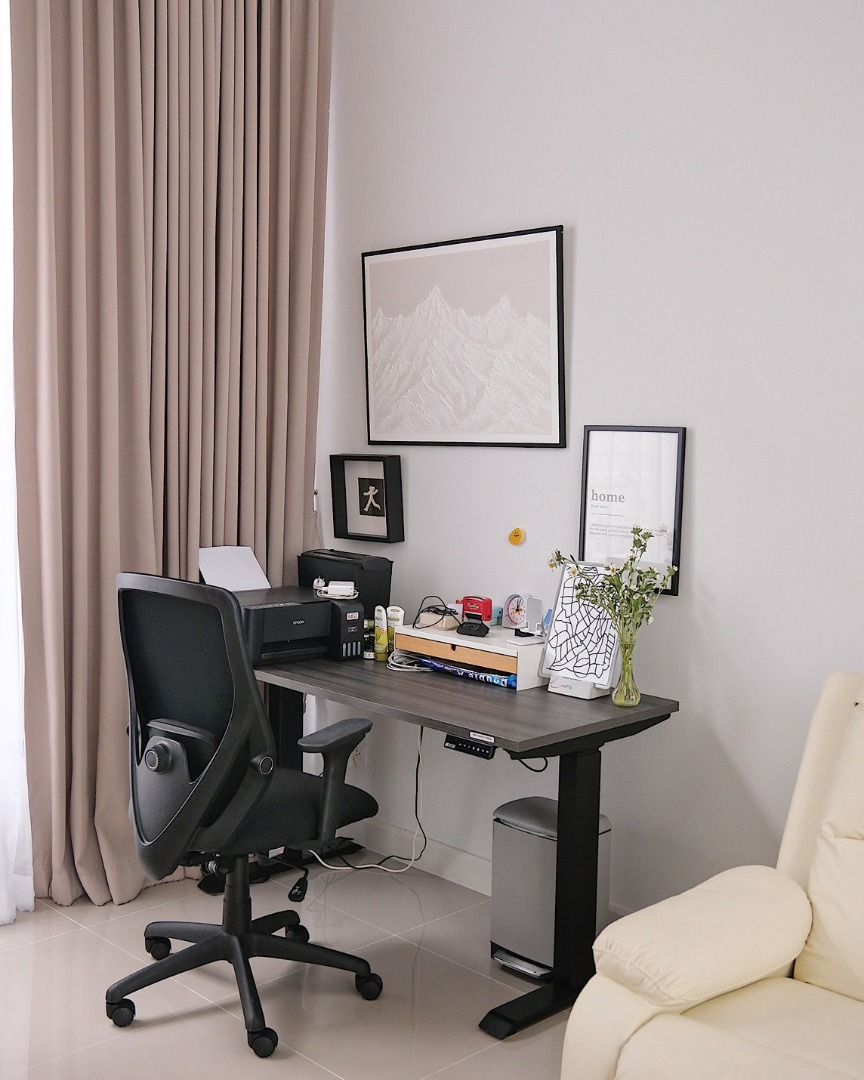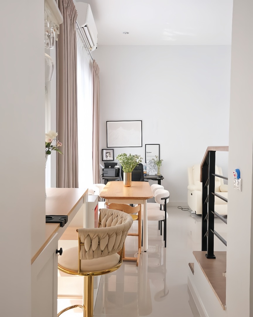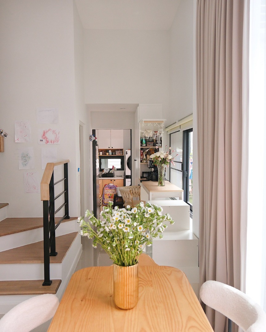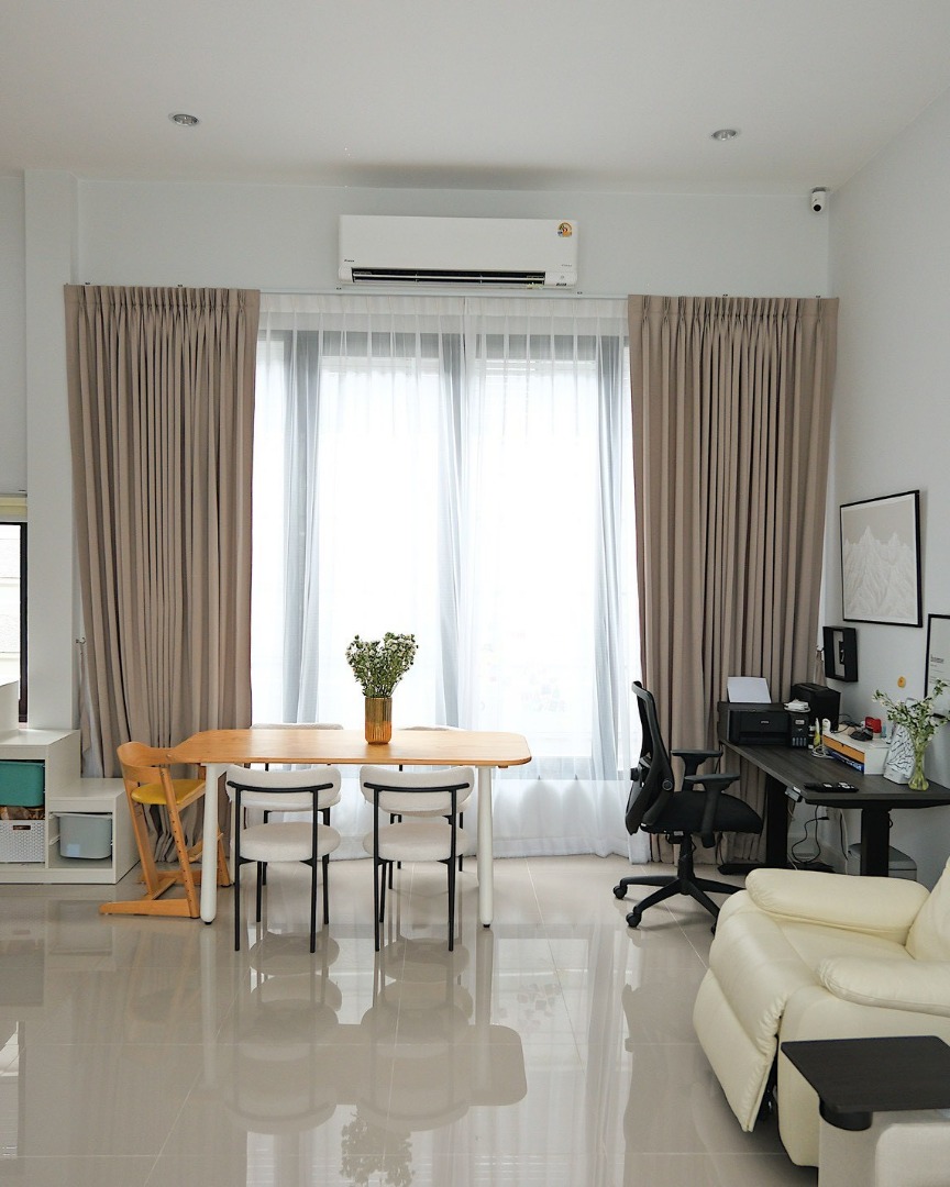 - The dining zone is continuous with the living room. Allow family members to live together in all activities - install curtains for the entire house. With mosquito screen on the 1st floor